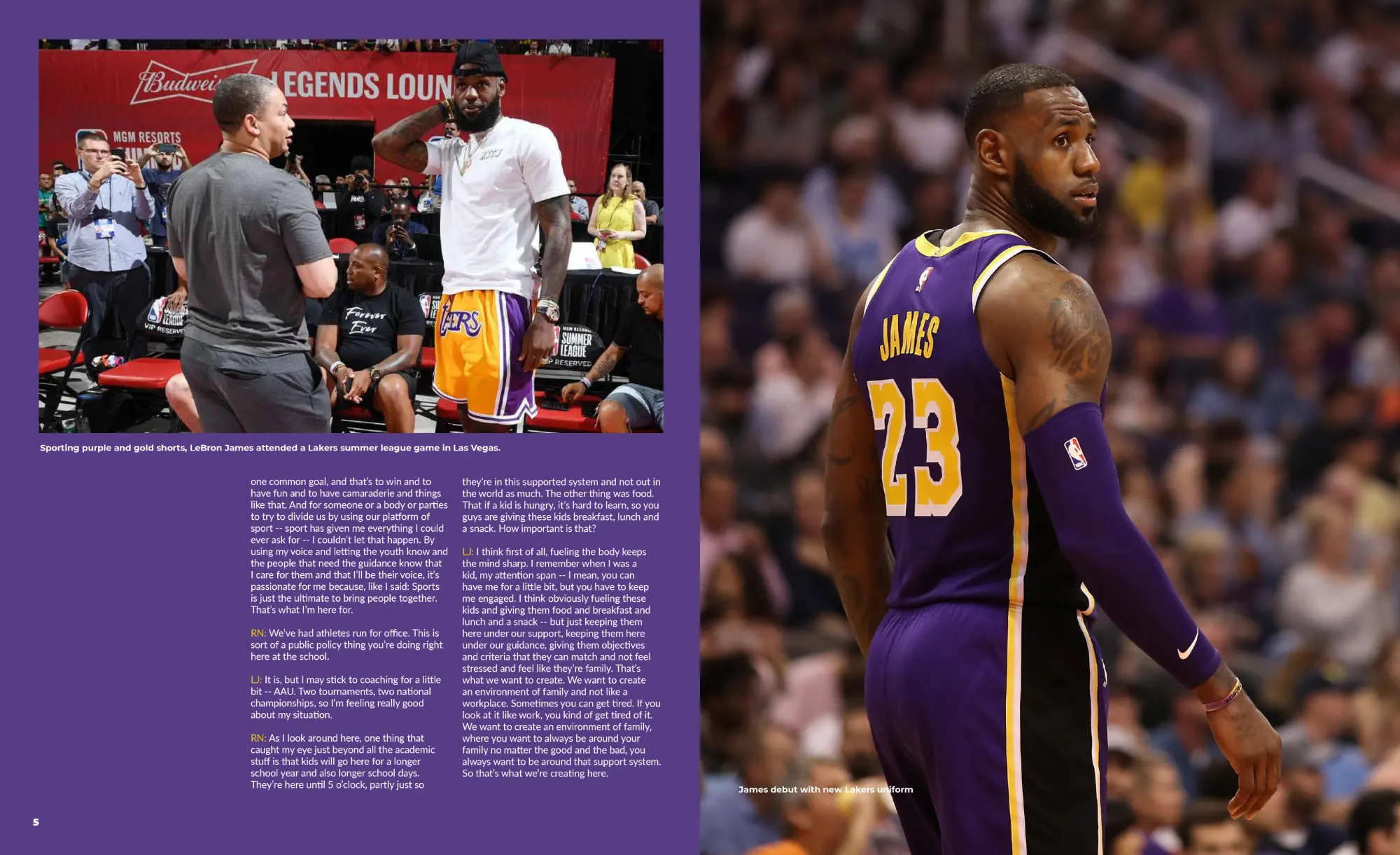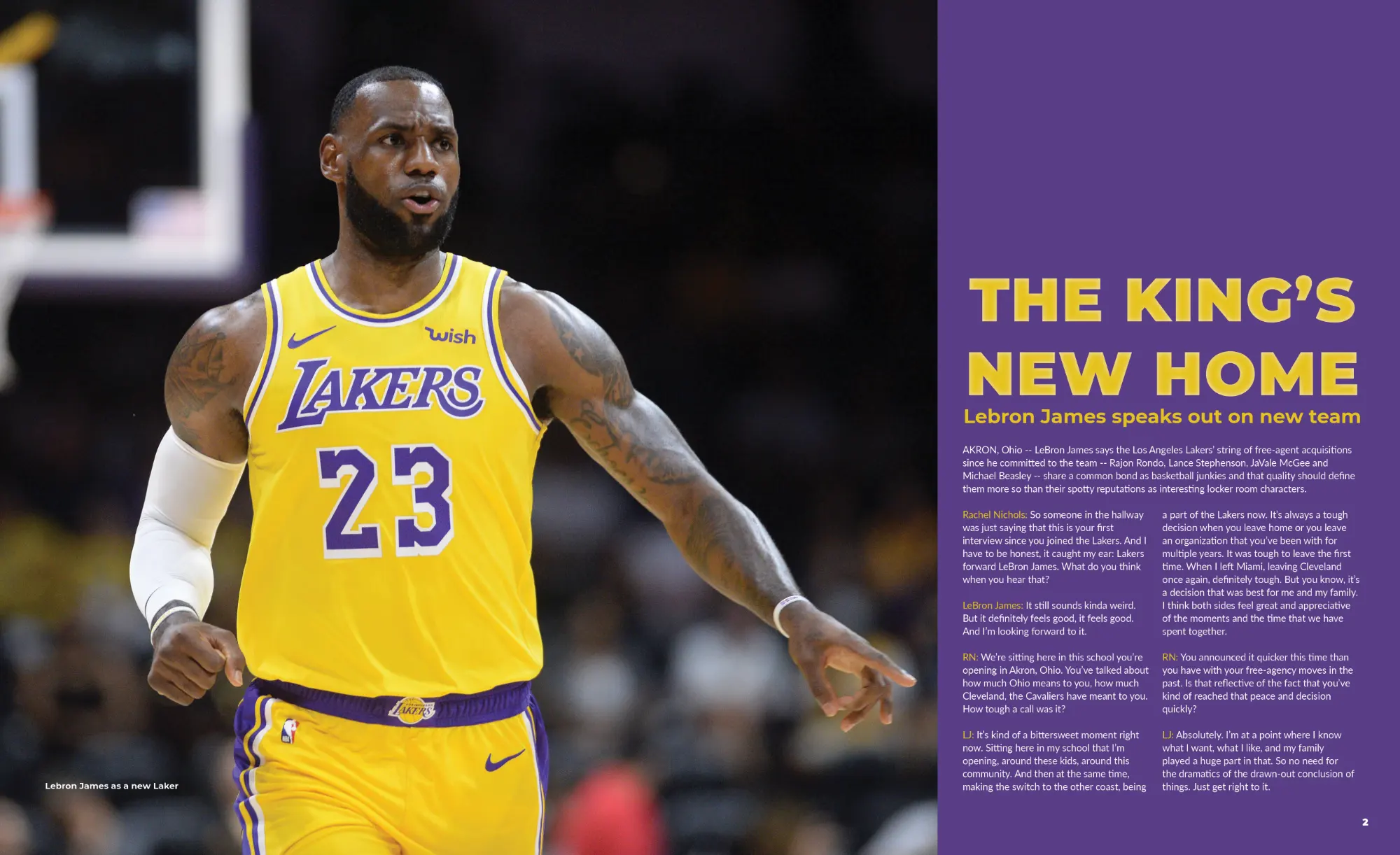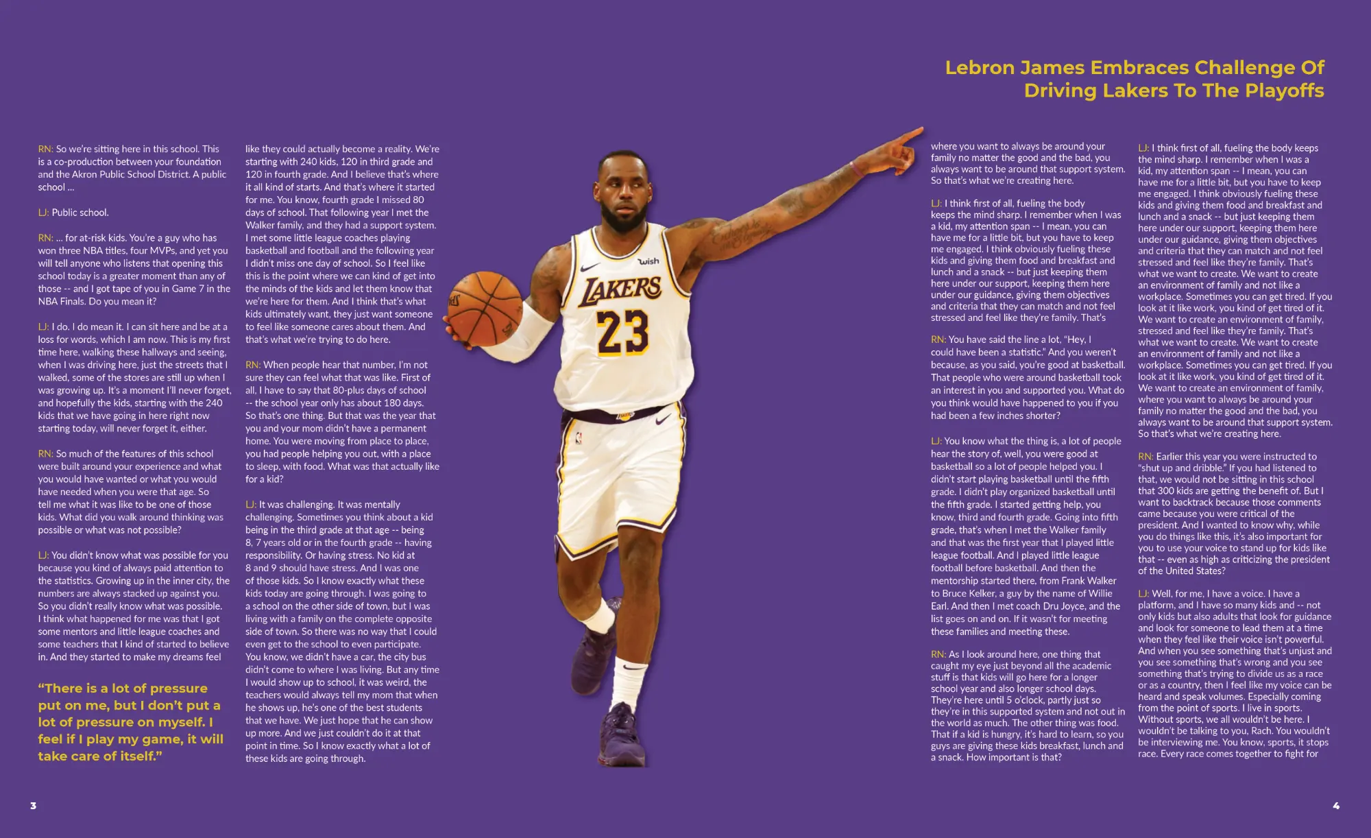 The thought process behind designing this spread was that I incorporated a two-column text layout on each page to neutralize the text-heavy transcript of ESPN's interview with Lebron James and to maintain balance into each page. Also, large and small images, a sidebar, and negative space alongside the san-serif typefaces that are Montserrat and Lato helped complement the overall aesthetic of this magazine article in addition to the color choice which was supposed represent the exact colors of the Los Angeles Lakers.